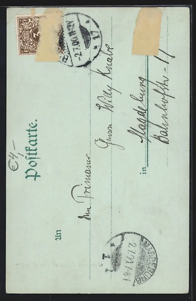 alte Ansichtskarte, gelaufen 1900, rückseitig Klebe- und Papierreste, Eckknick oben re., guter Zustand