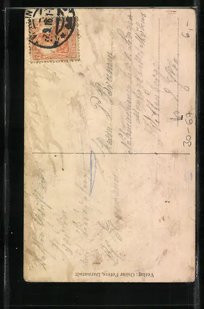 Personenbezogene Daten auf der Rückseite der Karte wurden durch blauen Textmarker unkenntlich gemacht. Die blauen Stellen sind auf die Vorderseite durchgeweicht und wirken sich negativ auf das Postkartenfoto aus