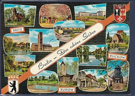 AK Berlin - Der schöne Süden 13.Ansichten Britz Alte Dorfkirche - Onkel Bräsig Straße - Einstein Schule - Schloß - Hephata Kirche - Ladenzentrum Buckow - Rudow Freiluft und Schwimmbad - Dorfkirche - Am Dorfteich - Städt. Krankenhaus Neukölln - Dorfteich mit Kirche - Jungfernmühle, nicht gelaufen von ca. 1970