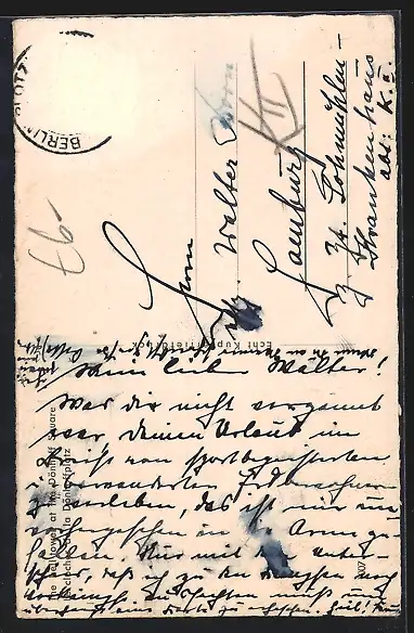 alte Ansichtskarte, gelaufen, Briefmarke entfernt, rückseitig Oberflächenschaden, Stempelspur, guter Zustand