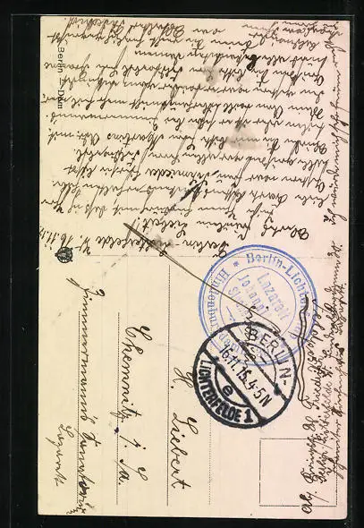 Personenbezogene Daten auf der Rückseite der Karte wurden durch blauen Textmarker unkenntlich gemacht. Die blauen Stellen sind auf die Vorderseite durchgeweicht und wirken sich negativ auf das Postkartenfoto aus
