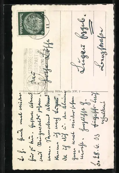 gelaufen 1933, Eckknick oben rechts, guter Zustand