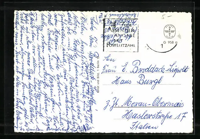 Personenbezogene Daten auf der Rückseite der Karte wurden durch blauen Textmarker unkenntlich gemacht. Die blauen Stellen sind auf die Vorderseite durchgeweicht und wirken sich negativ auf das Postkartenfoto aus