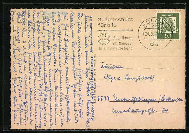 Personenbezogene Daten auf der Rückseite der Karte wurden durch blauen Textmarker unkenntlich gemacht. Die blauen Stellen sind auf die Vorderseite durchgeweicht und wirken sich negativ auf das Postkartenfoto aus