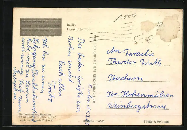Personenbezogene Daten auf der Rückseite der Karte wurden durch blauen Textmarker unkenntlich gemacht. Die blauen Stellen sind auf die Vorderseite durchgeweicht und wirken sich negativ auf das Postkartenfoto aus