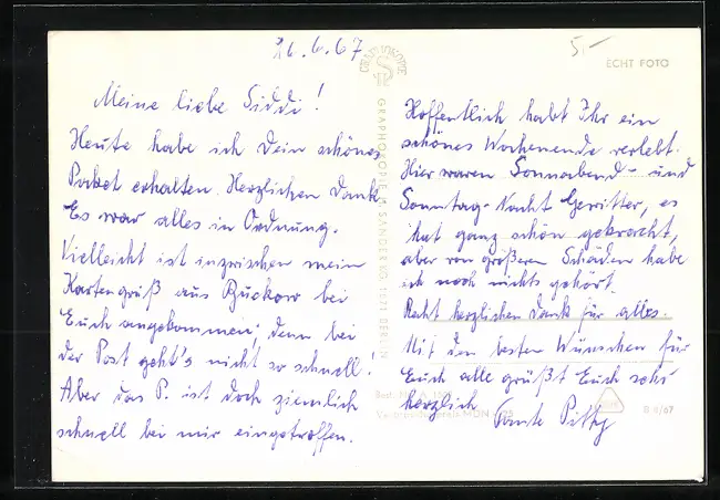 Personenbezogene Daten auf der Rückseite der Karte wurden durch blauen Textmarker unkenntlich gemacht. Die blauen Stellen sind auf die Vorderseite durchgeweicht und wirken sich negativ auf das Postkartenfoto aus