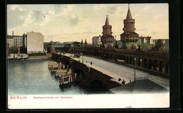 AK Berlin-Friedrichshain, Oberbaumbrücke mit Hochbahn