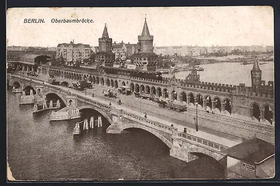 AK Berlin-Friedrichshain, Zug auf der Oberbaumbrücke, Pferdegespanne