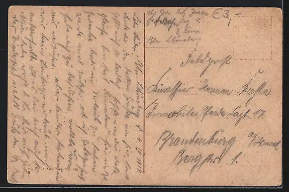 Personenbezogene Daten auf der Rückseite der Karte wurden durch blauen Textmarker unkenntlich gemacht. Die blauen Stellen sind auf die Vorderseite durchgeweicht und wirken sich negativ auf das Postkartenfoto aus
