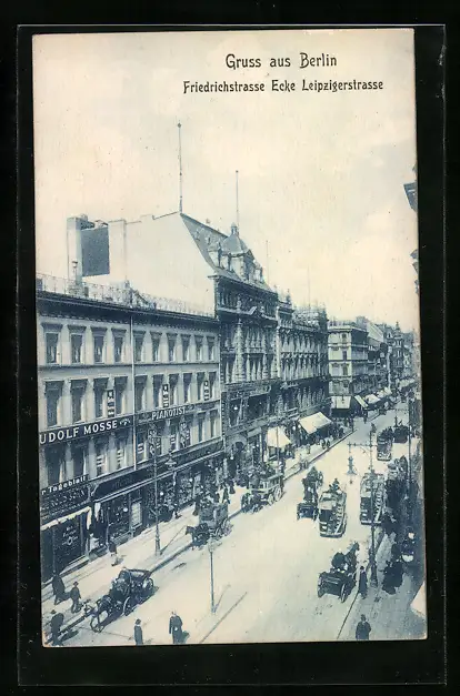 AK Berlin, Friedrichstrasse Ecke Leipzigerstrasse, Busse, Pferdefuhrwerke