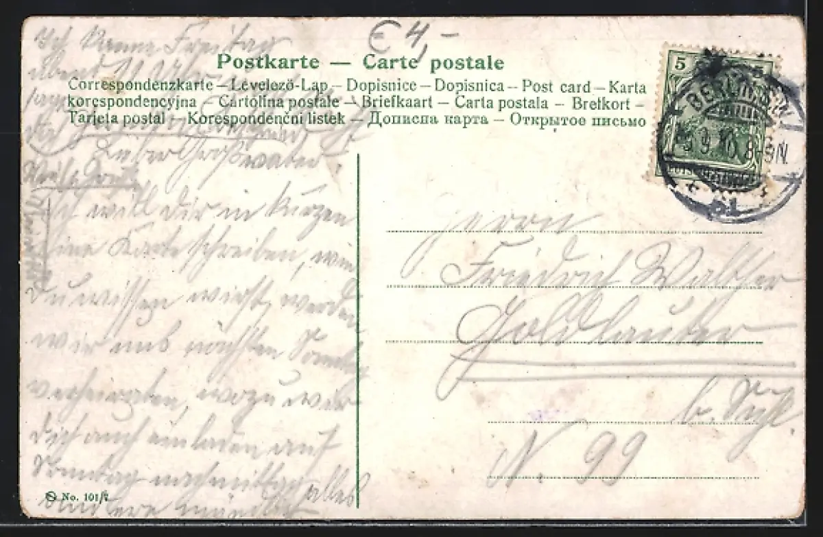Personenbezogene Daten auf der Rückseite der Karte wurden durch blauen Textmarker unkenntlich gemacht. Die blauen Stellen sind auf die Vorderseite durchgeweicht und wirken sich negativ auf das Postkartenfoto aus
