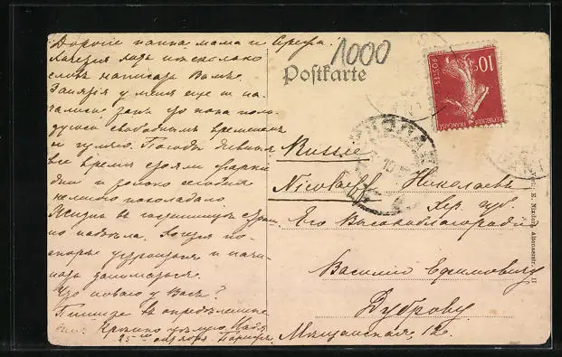 Personenbezogene Daten auf der Rückseite der Karte wurden durch blauen Textmarker unkenntlich gemacht. Die blauen Stellen sind auf die Vorderseite durchgeweicht und wirken sich negativ auf das Postkartenfoto aus