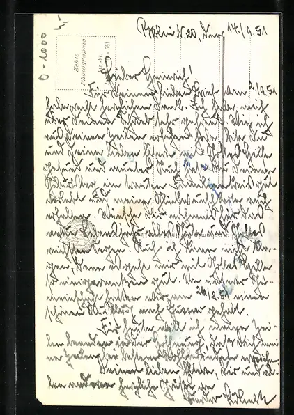 Personenbezogene Daten auf der Rückseite der Karte wurden durch blauen Textmarker unkenntlich gemacht. Die blauen Stellen sind auf die Vorderseite durchgeweicht und wirken sich negativ auf das Postkartenfoto aus