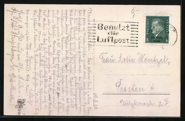 Personenbezogene Daten auf der Rückseite der Karte wurden durch blauen Textmarker unkenntlich gemacht. Die blauen Stellen sind auf die Vorderseite durchgeweicht und wirken sich negativ auf das Postkartenfoto aus