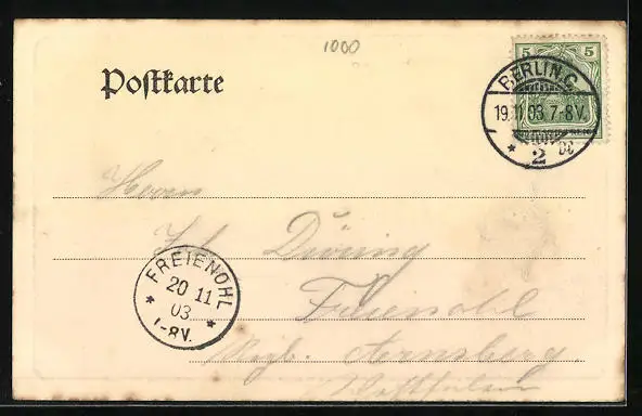 alte Ansichtskarte, gelaufen 1903, Eckknicke oben, Oberflächenschaden, guter Zustand