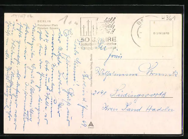 Personenbezogene Daten auf der Rückseite der Karte wurden durch blauen Textmarker unkenntlich gemacht. Die blauen Stellen sind auf die Vorderseite durchgeweicht und wirken sich negativ auf das Postkartenfoto aus