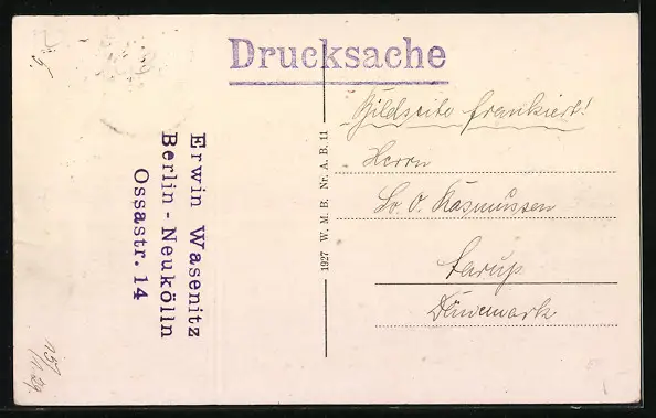 Personenbezogene Daten auf der Rückseite der Karte wurden durch blauen Textmarker unkenntlich gemacht. Die blauen Stellen sind auf die Vorderseite durchgeweicht und wirken sich negativ auf das Postkartenfoto aus