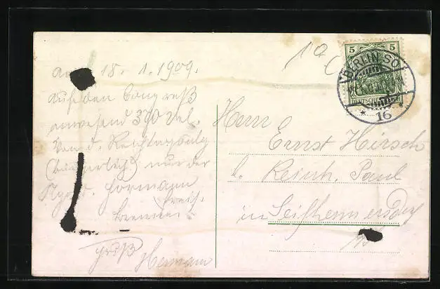 gelaufen 1909, rückseitig Klebe- und Papierreste, guter Zustand