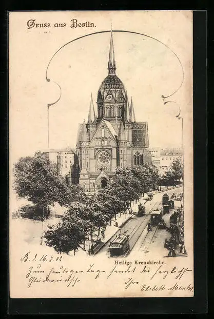 AK Berlin, Heilige Kreuzkirche mit Strassenbahn