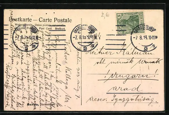 gelaufen 1913, Eckknick unten links, guter Zustand
