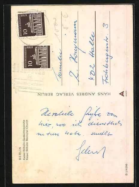 Personenbezogene Daten auf der Rückseite der Karte wurden durch blauen Textmarker unkenntlich gemacht. Die blauen Stellen sind auf die Vorderseite durchgeweicht und wirken sich negativ auf das Postkartenfoto aus