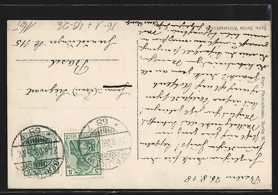 Personenbezogene Daten auf der Rückseite der Karte wurden durch blauen Textmarker unkenntlich gemacht. Die blauen Stellen sind auf die Vorderseite durchgeweicht und wirken sich negativ auf das Postkartenfoto aus