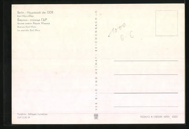 Personenbezogene Daten auf der Rückseite der Karte wurden durch blauen Textmarker unkenntlich gemacht. Die blauen Stellen sind auf die Vorderseite durchgeweicht und wirken sich negativ auf das Postkartenfoto aus