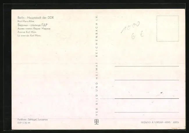 Personenbezogene Daten auf der Rückseite der Karte wurden durch blauen Textmarker unkenntlich gemacht. Die blauen Stellen sind auf die Vorderseite durchgeweicht und wirken sich negativ auf das Postkartenfoto aus