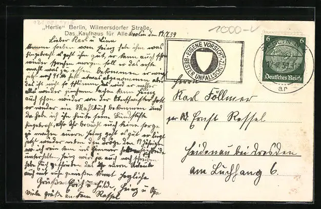 Personenbezogene Daten auf der Rückseite der Karte wurden durch blauen Textmarker unkenntlich gemacht. Die blauen Stellen sind auf die Vorderseite durchgeweicht und wirken sich negativ auf das Postkartenfoto aus