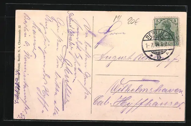 Personenbezogene Daten auf der Rückseite der Karte wurden durch blauen Textmarker unkenntlich gemacht. Die blauen Stellen sind auf die Vorderseite durchgeweicht und wirken sich negativ auf das Postkartenfoto aus