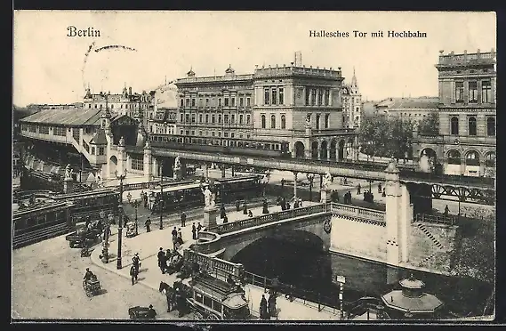 AK Berlin-Kreuzberg, Hallesches Tor mit Hochbahn und Strassenbahn
