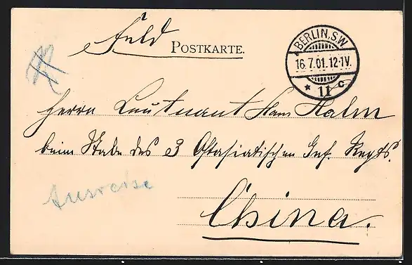 Personenbezogene Daten auf der Rückseite der Karte wurden durch blauen Textmarker unkenntlich gemacht. Die blauen Stellen sind auf die Vorderseite durchgeweicht und wirken sich negativ auf das Postkartenfoto aus