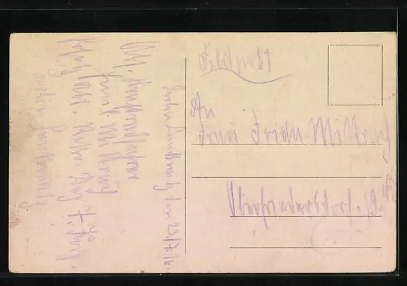Personenbezogene Daten auf der Rückseite der Karte wurden durch blauen Textmarker unkenntlich gemacht. Die blauen Stellen sind auf die Vorderseite durchgeweicht und wirken sich negativ auf das Postkartenfoto aus