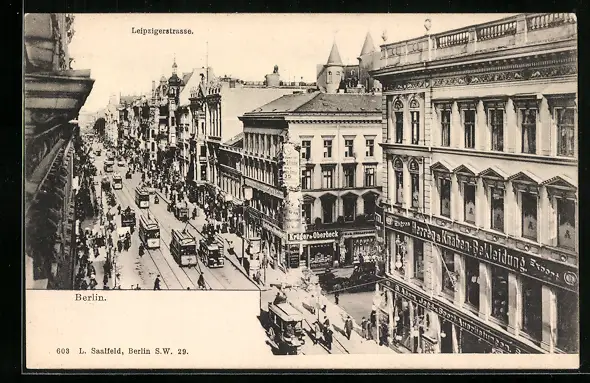 AK Berlin, Leipzigerstrasse mit Geschäften und Strassenbahn