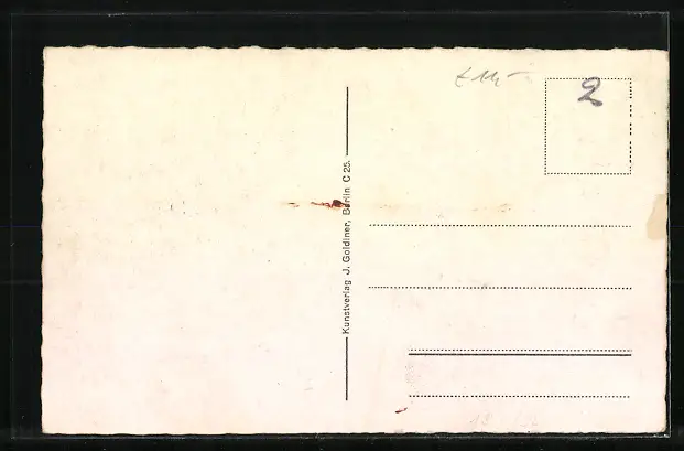 Personenbezogene Daten auf der Rückseite der Karte wurden durch blauen Textmarker unkenntlich gemacht. Die blauen Stellen sind auf die Vorderseite durchgeweicht und wirken sich negativ auf das Postkartenfoto aus