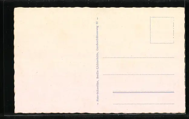 Personenbezogene Daten auf der Rückseite der Karte wurden durch blauen Textmarker unkenntlich gemacht. Die blauen Stellen sind auf die Vorderseite durchgeweicht und wirken sich negativ auf das Postkartenfoto aus