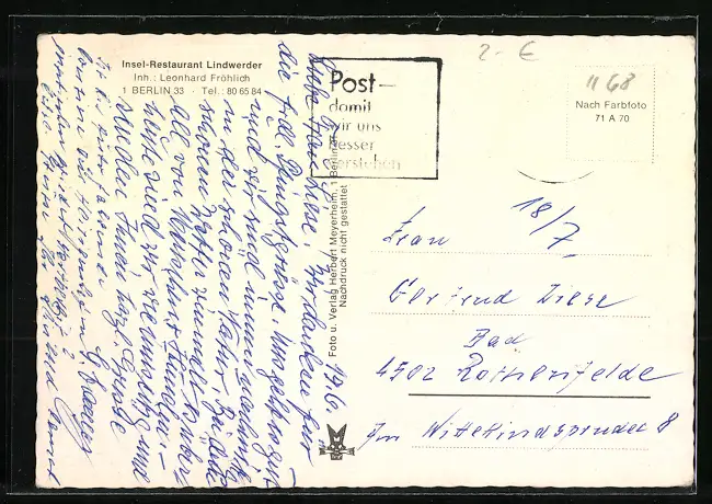 Personenbezogene Daten auf der Rückseite der Karte wurden durch blauen Textmarker unkenntlich gemacht. Die blauen Stellen sind auf die Vorderseite durchgeweicht und wirken sich negativ auf das Postkartenfoto aus