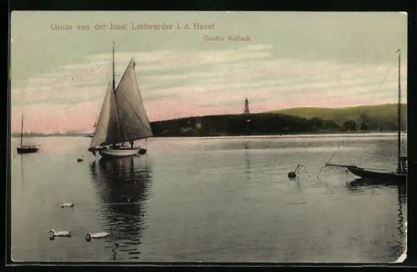 AK Berlin-Lindwerder i. d. Havel, Leuchtturm in der Dämmerung