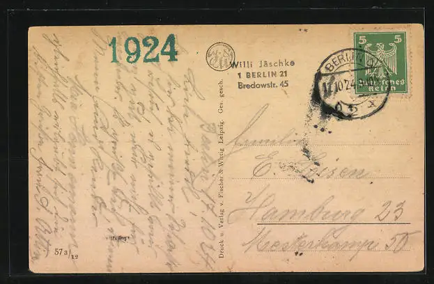gelaufen 1924, Eckknick re. untem, Stempelspur, guter Zustand