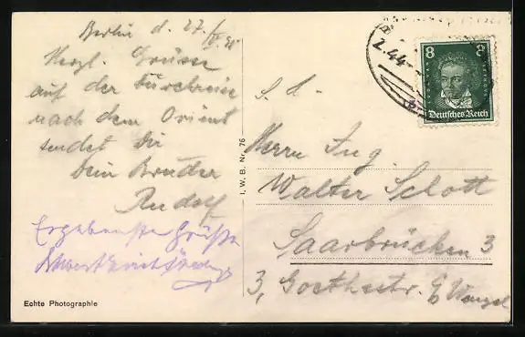Personenbezogene Daten auf der Rückseite der Karte wurden durch blauen Textmarker unkenntlich gemacht. Die blauen Stellen sind auf die Vorderseite durchgeweicht und wirken sich negativ auf das Postkartenfoto aus