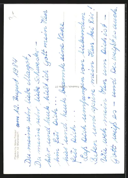 Personenbezogene Daten auf der Rückseite der Karte wurden durch blauen Textmarker unkenntlich gemacht. Die blauen Stellen sind auf die Vorderseite durchgeweicht und wirken sich negativ auf das Postkartenfoto aus