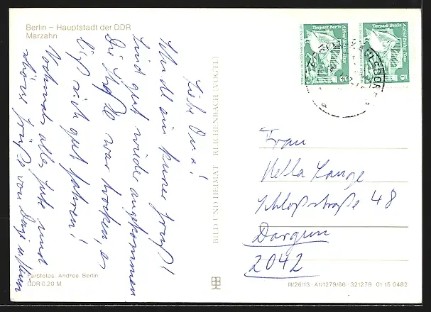Personenbezogene Daten auf der Rückseite der Karte wurden durch blauen Textmarker unkenntlich gemacht. Die blauen Stellen sind auf die Vorderseite durchgeweicht und wirken sich negativ auf das Postkartenfoto aus