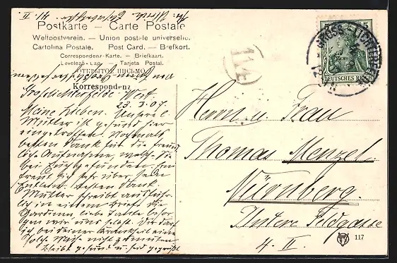 alte Ansichtskarte, gelaufen 1907, Stempelspur, guter Zustand