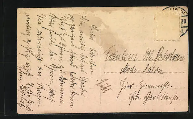 Personenbezogene Daten auf der Rückseite der Karte wurden durch blauen Textmarker unkenntlich gemacht. Die blauen Stellen sind auf die Vorderseite durchgeweicht und wirken sich negativ auf das Postkartenfoto aus