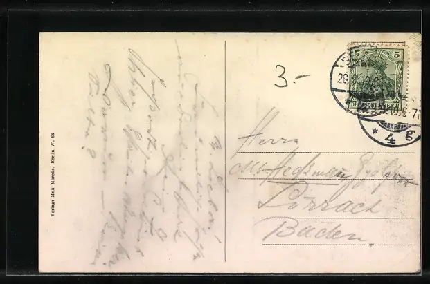 Personenbezogene Daten auf der Rückseite der Karte wurden durch blauen Textmarker unkenntlich gemacht. Die blauen Stellen sind auf die Vorderseite durchgeweicht und wirken sich negativ auf das Postkartenfoto aus