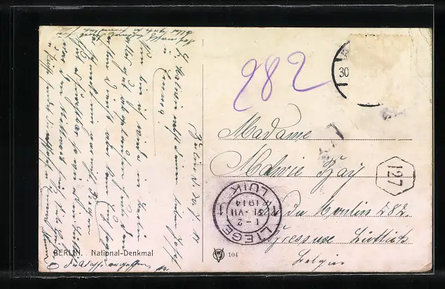 Personenbezogene Daten auf der Rückseite der Karte wurden durch blauen Textmarker unkenntlich gemacht. Die blauen Stellen sind auf die Vorderseite durchgeweicht und wirken sich negativ auf das Postkartenfoto aus