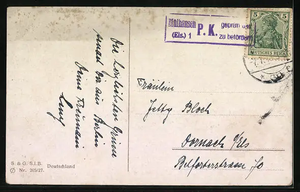 Personenbezogene Daten auf der Rückseite der Karte wurden durch blauen Textmarker unkenntlich gemacht. Die blauen Stellen sind auf die Vorderseite durchgeweicht und wirken sich negativ auf das Postkartenfoto aus