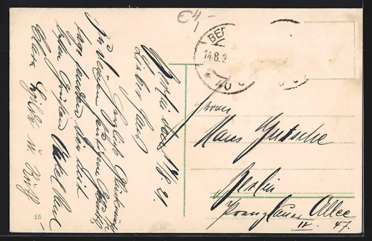 Personenbezogene Daten auf der Rückseite der Karte wurden durch blauen Textmarker unkenntlich gemacht. Die blauen Stellen sind auf die Vorderseite durchgeweicht und wirken sich negativ auf das Postkartenfoto aus
