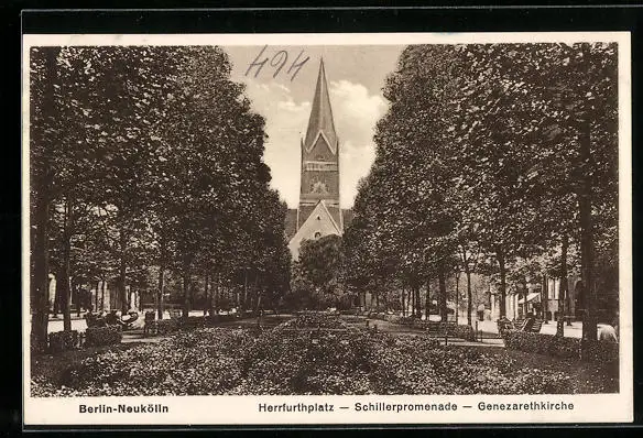 AK Berlin-Neukölln, Herrfurthplatz und Schillerpromenade mit Genezarethkirche