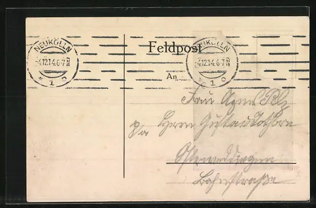 Personenbezogene Daten auf der Rückseite der Karte wurden durch blauen Textmarker unkenntlich gemacht. Die blauen Stellen sind auf die Vorderseite durchgeweicht und wirken sich negativ auf das Postkartenfoto aus